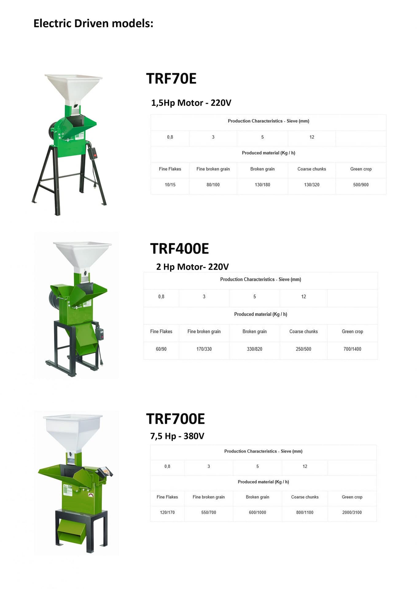 Electric TRF700E with 7,5hp, 380V Producing from 120 to 3100 kg/hour Max diameter when chipping 30mm