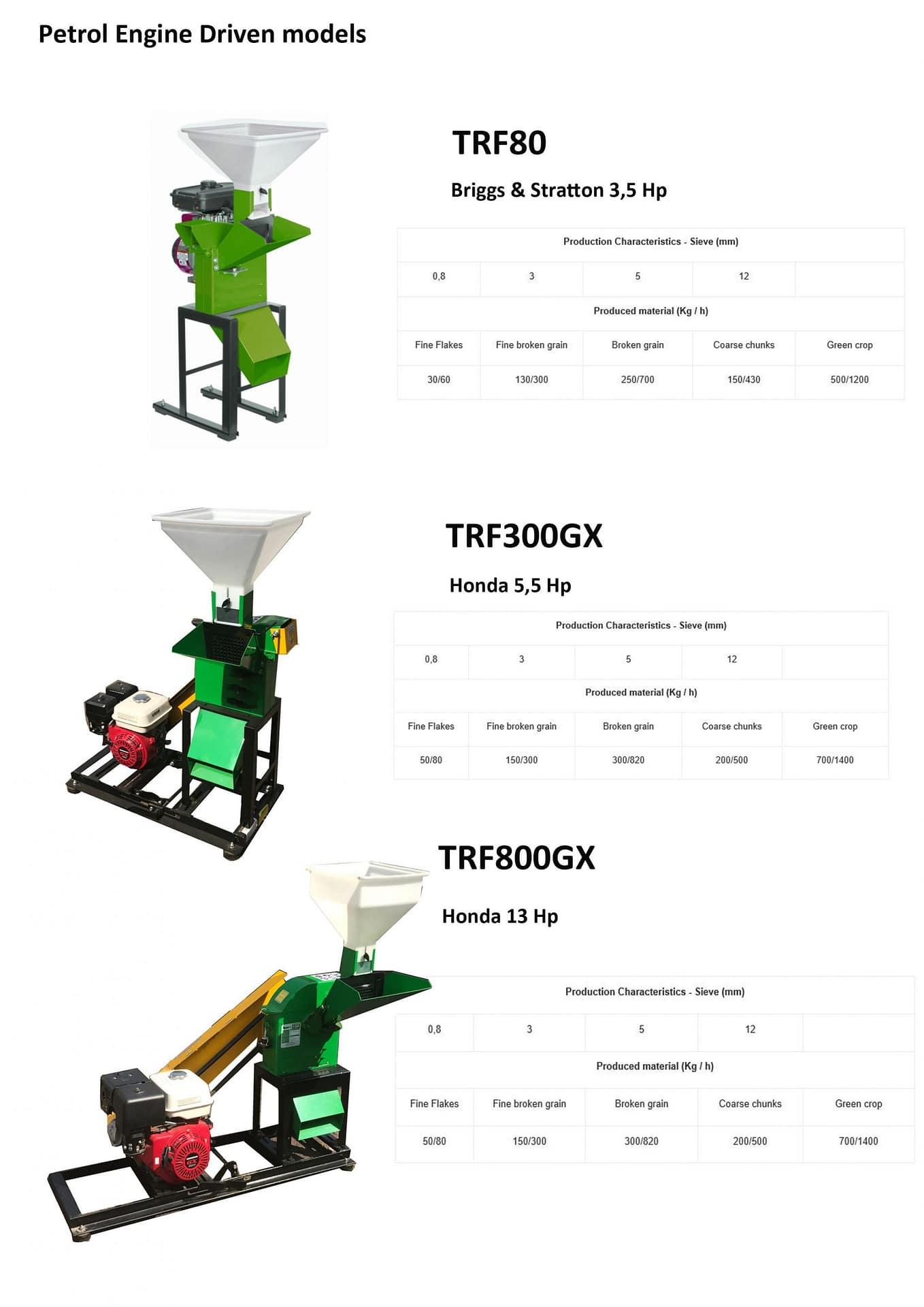 TRF800 with 13hp Honda petrol engine producing 50 to 1400 kg/hour Max diameter when chipping 35mm